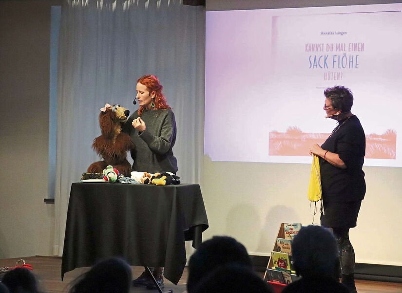 „Gott sei Dank ist nichts passiert“, ist Lotte erleichtert, dass der Hase den Wolf zum Mond geschossen hat. Besorgt ist nun aber Tania, kratzt sich die Hündin doch verdächtig hinter dem Ohr. Ein Floh! Wie es der Zufall will, hat von Lieven eine passende Geschichte dabei. „Kannst du mal einen Sack Flöhe hüten?“, gibt sie deren Titel als Frage an die Kinder weiter. Manche bejahen das zunächst noch. Ein Krokodil würde ja gerne in den Sack schauen. Darf das aber nicht und weint deshalb ganz, ganz dicke Tränen – ehe es mit einem Trick versucht, dem Kind den Sack voll Flöhe zu stibitzen.